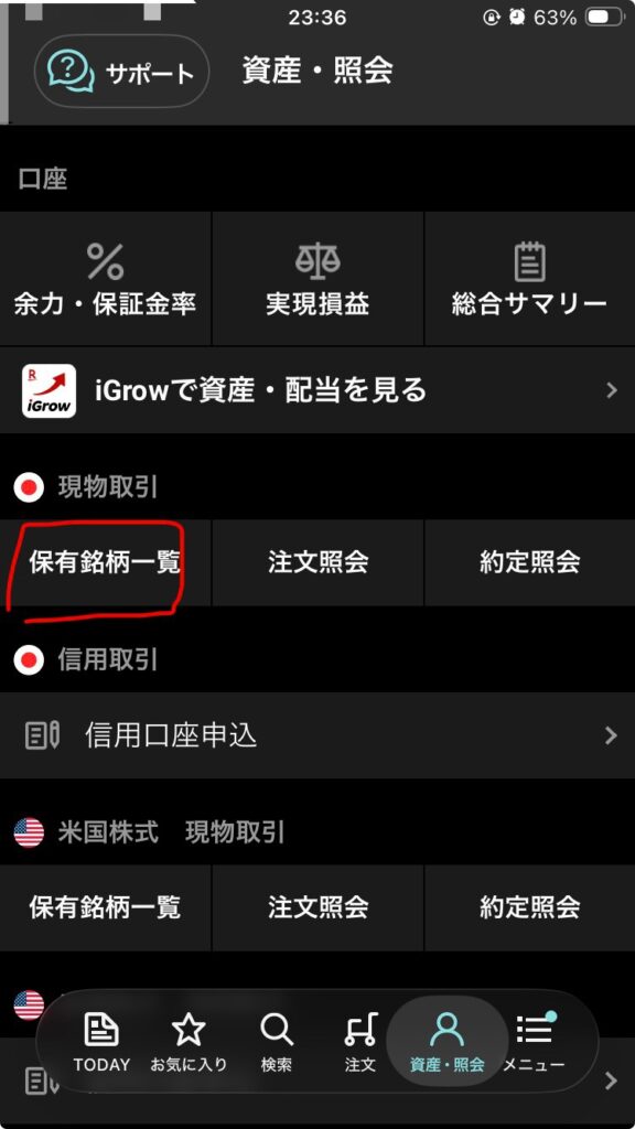 ▲ 画面下部「資産・照会」→「保有銘柄一覧」(赤丸)をタップ