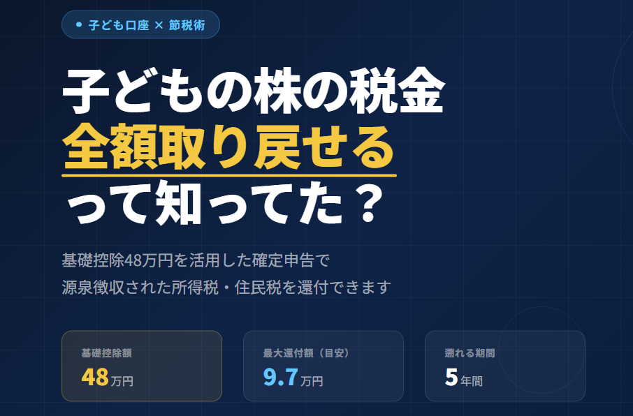 基礎控除48万円は年齢に関わらず適用されます。子どもの株の利益が48万円以内であれば、確定申告をすることで源泉徴収された税金の全額が還付される可能性があります。